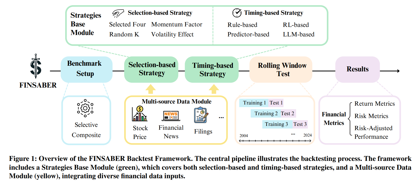 FINSABER backtesting workflow covering symbol selection, signal generation, and survivorship-bias free evaluation.