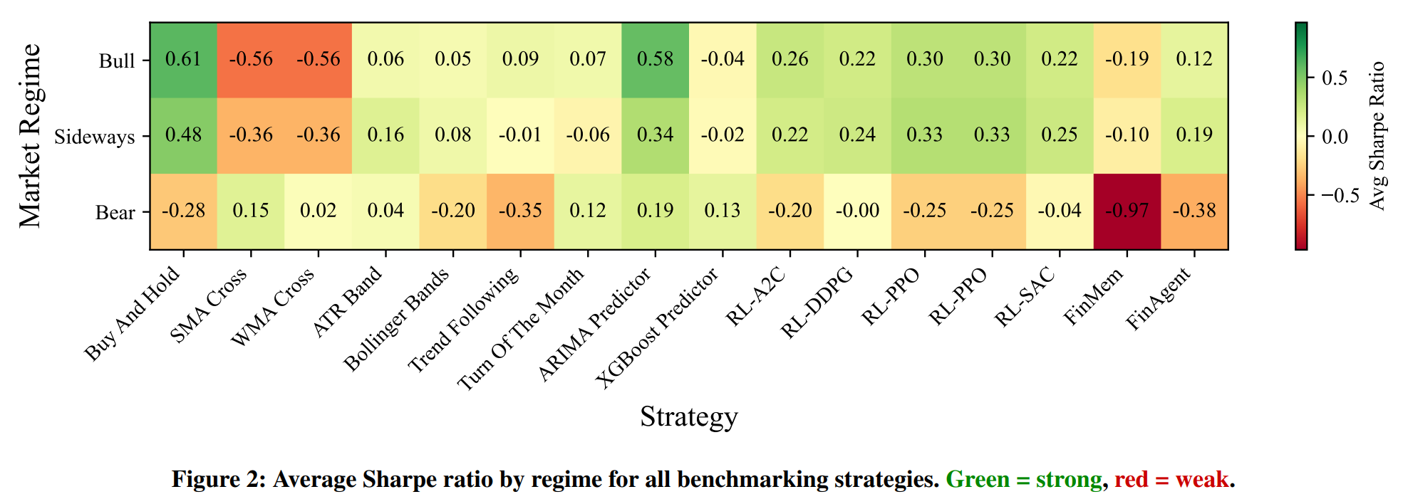 Regime-aware Sharpe ratio evaluation highlights over-conservative behaviour in bull markets and aggressive drawdowns in bear markets.