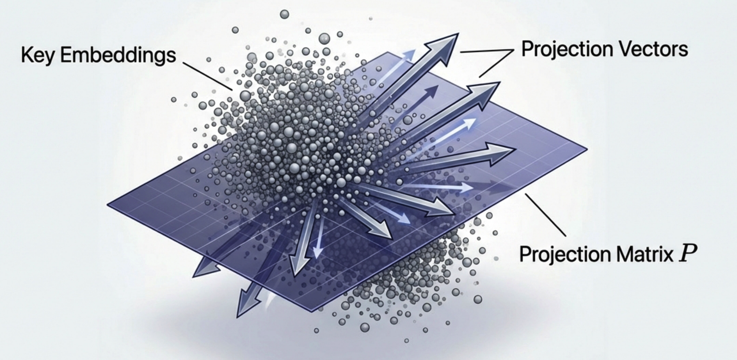We learn a projection matrix $P$ via SVD on contrastive key embeddings. This captures the 'direction' of relevance without retraining the model.